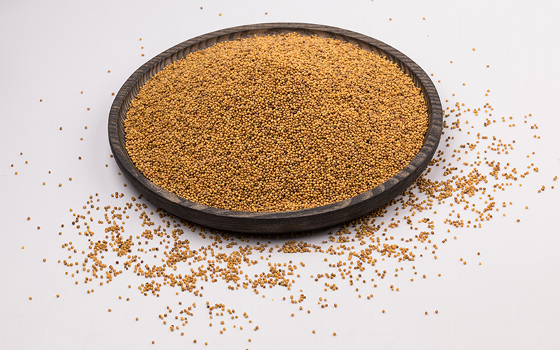 Hàng lọc, khô sạch. Hạt nhỏ hình cầu, đường kính 1,5 mm đến 3 mm, mặt ngoài màu trắng xám hay vàng nhạt, cỏ vân hình mạng rất nhỏ, rốn hạt hình chấm nhỏ rõ. Hạt khô chắc, khi ngâm nước nở to ra. Lớp vỏ cứng mỏng, bóng. Khi cắt hạt ra thấy có lá mầm gấp, màu trắng, có chất dầu, không màu, vị hăng cay.