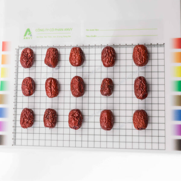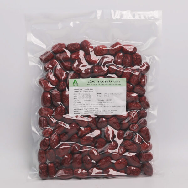 Hàng Táo đỏ 180 quả/kg, chắc, ngọt. Quả hình bầu dục hoặc hình trứng, dài 2 cm đển 3,5 cm, đường kính 1,5 cm đến 2,5 cm. Vỏ quả ngoài mỏng, nhăn nheo, màu hồng tối, hơi sáng bóng, vỏ quả giữa mềm, xốp, ngọt và có dầu, màu vàng nâu hay nâu nhạt, vỏ quả trong là một hạch cứng rắn, hình thoi dài, hai đầu nhọn. Mùi thơm đặc biệt, vị ngọt.